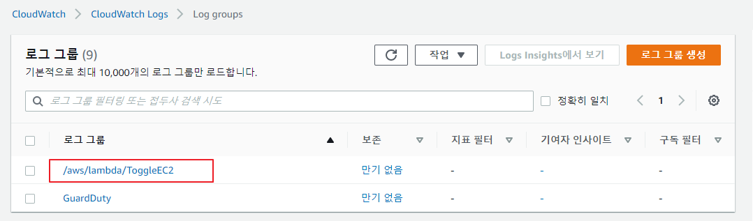 로그 그룹에는 람다 함수의 실행 이력이 남는 로그 그룹이 이미 생성돼 있다. 로그 그룹을 클릭한다.