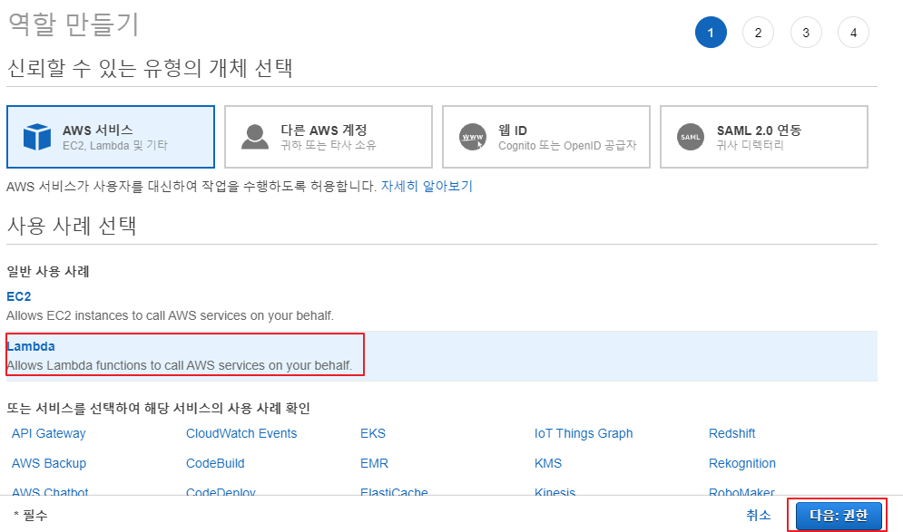 사용 사례에서 Lambda를 선택하고 다음: 권한 버튼을 클릭한다.