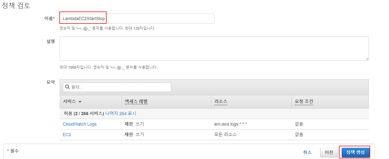 내용인즉슨, 첫 번째 Statement는 CloudWatch Log에 로그를 쌓을 수 있는 권한을 허용하는 것이며, 다음 절은 코드 그대로 ec2를 시작하고 종료하는 것이다.