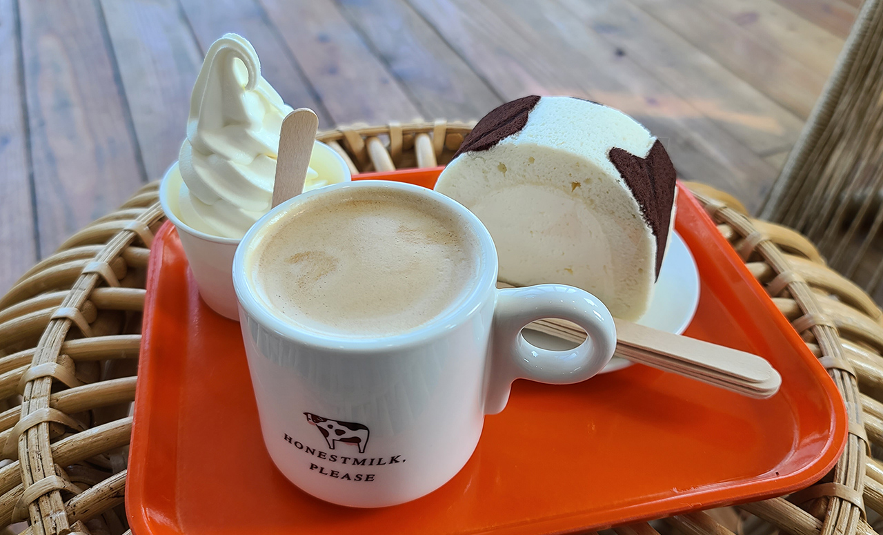 이번에는 생크림 롤이 있어 아메리카노와 함께 주문해본다. 생크림 롤은 얼룩소 모양이라 왠지 농장과 어울린다.